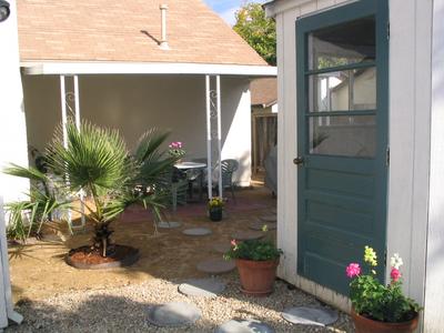 Behind the garage, and hidden from the main backyard, is a little patio.