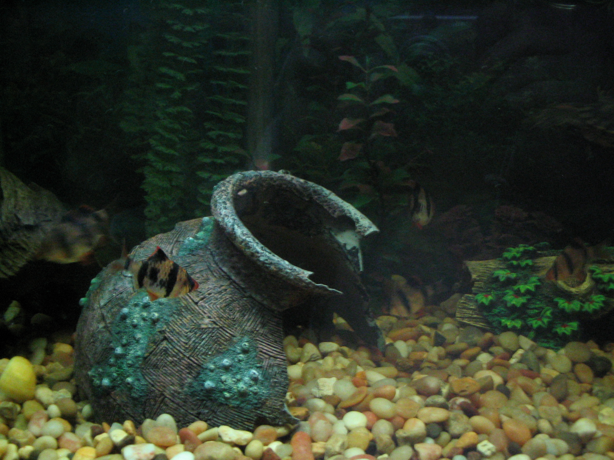 A lengthwise view of the aquarium. Shelly and Ellie are swimming with an apple snail on the broken pot.